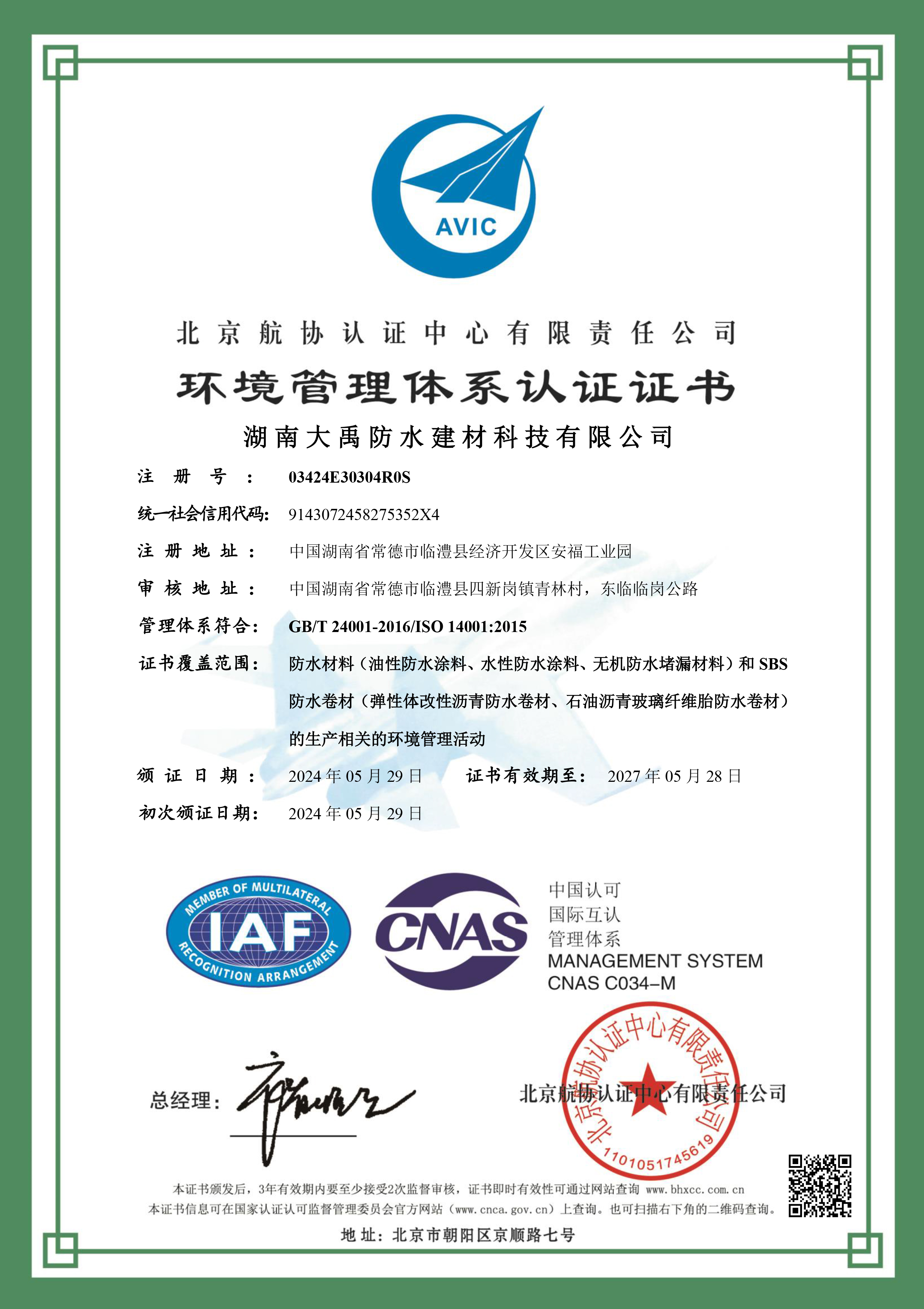 環(huán)境管理體系證書