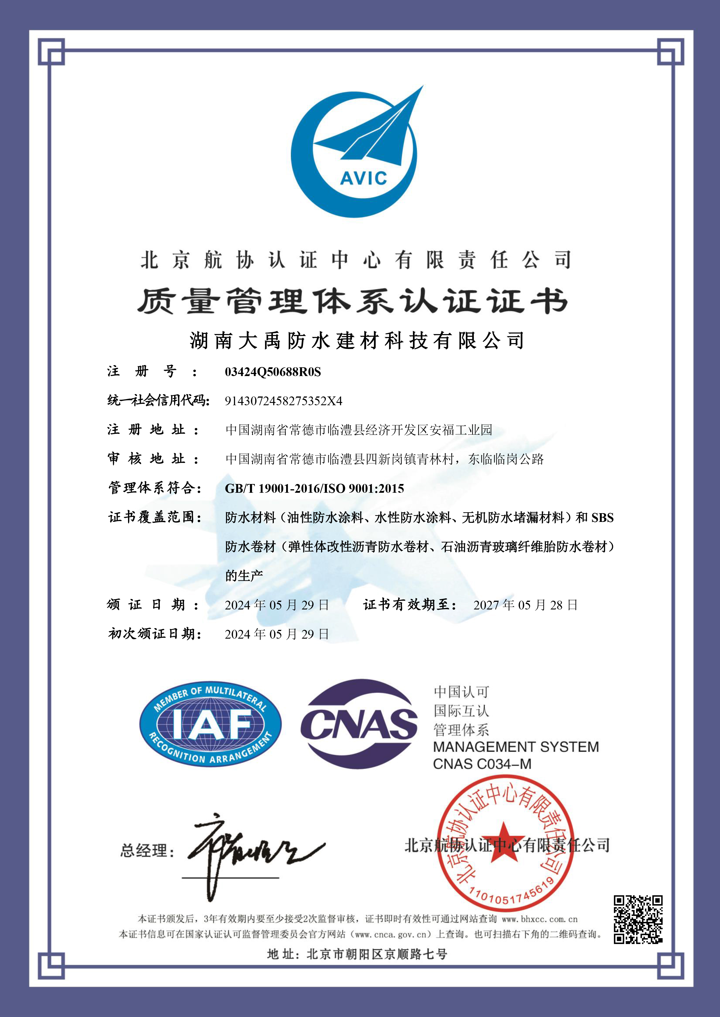 質(zhì)量管理體系證書
